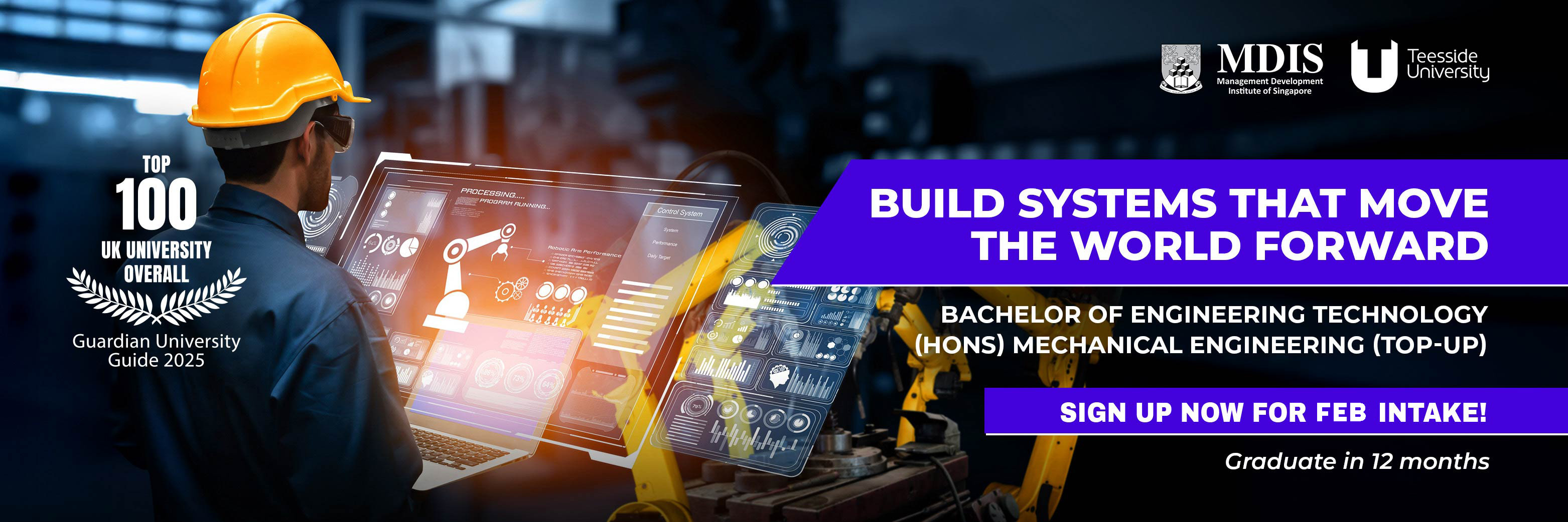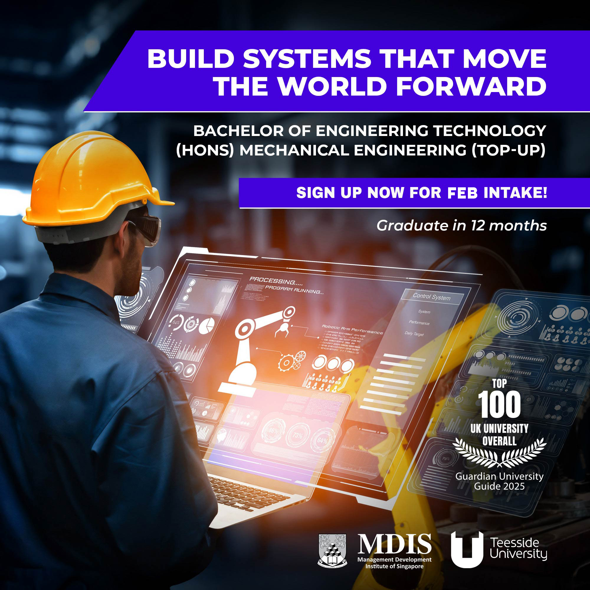 The Bachelor of Engineering Technology (Hons) in Mechanical Engineering (Top-Up), awarded by Teesside University (UK) and delivered at MDIS, is designed to deepen your expertise in mechanical systems, design, and innovation.