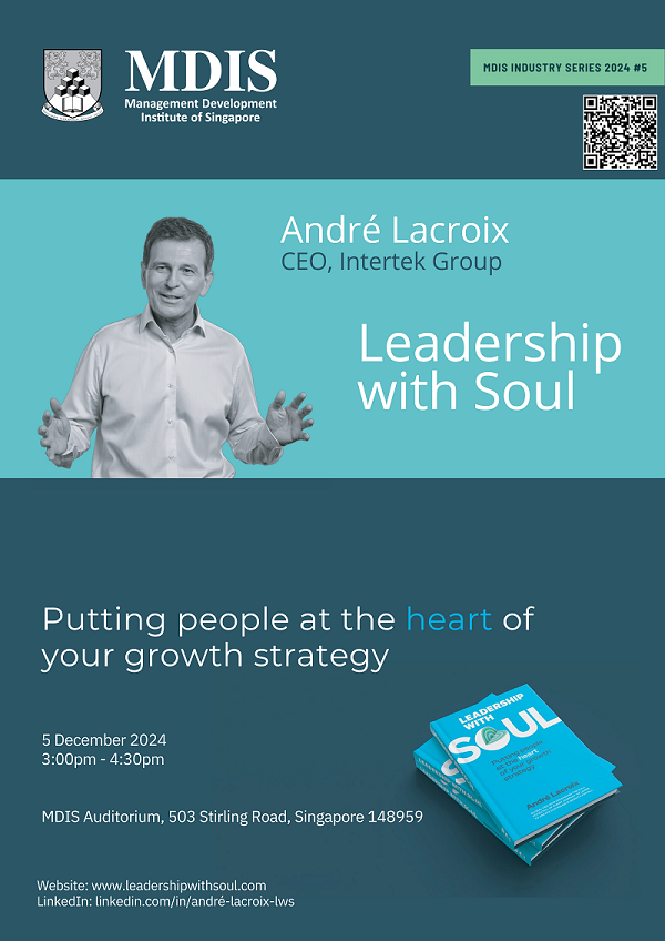 MDIS is pleased to invite you for the final event of the MDIS Industry Series 2024, featuring Leadership with Soul by Mr. André Lacroix, CEO of Intertek. This keynote lecture promises valuable insights on leadership and driving sustainable business growth, drawing on Mr. Lacroix’s vast experience with Euro Disney, Pepsi, and Burger King.